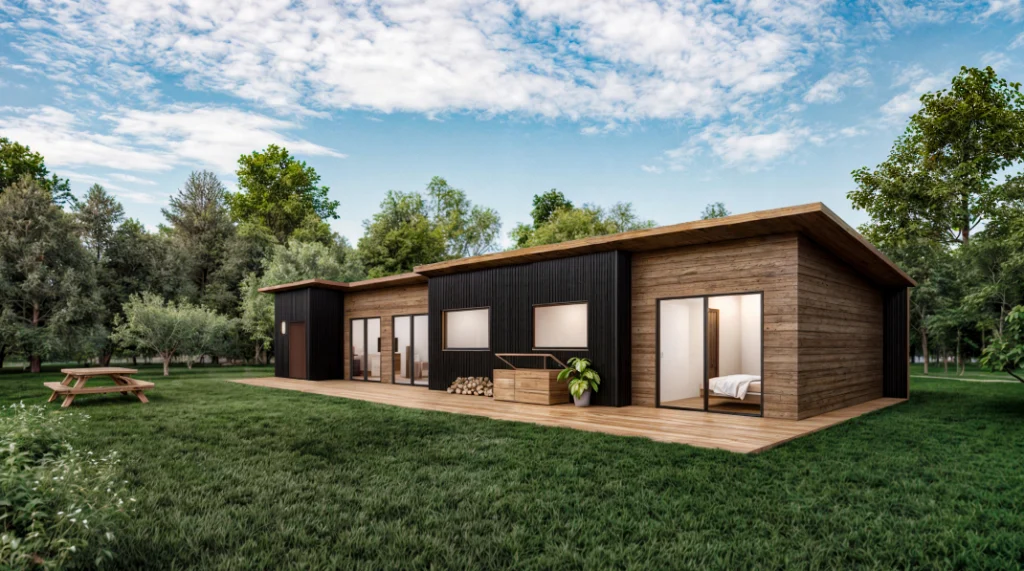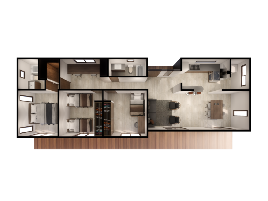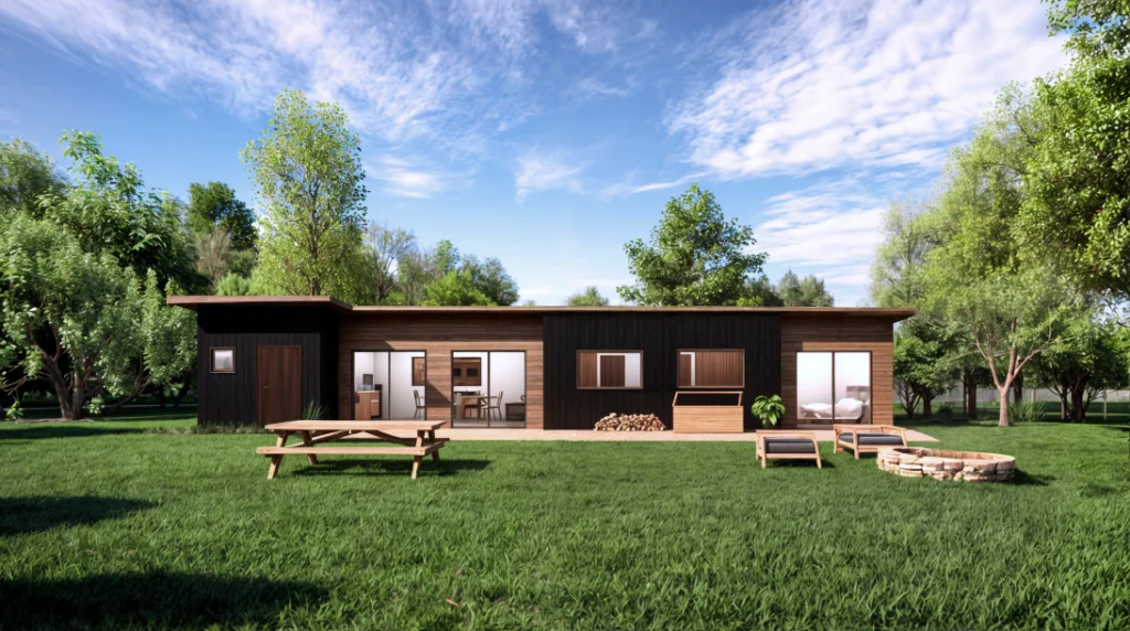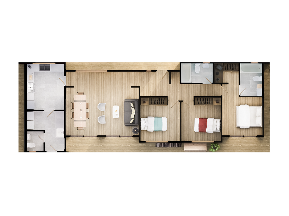 Con forma rectangular, las habitaciones ubicadas hacia atrás, a ambos lados de la zona común. Este diseño funciona especialmente bien si vienen visitas seguido o si son familia numerosa: cada dormitorio tiene su espacio, pero todos comparten el centro de la casa sin molestarse. Perfecta para vacaciones o como vivienda...