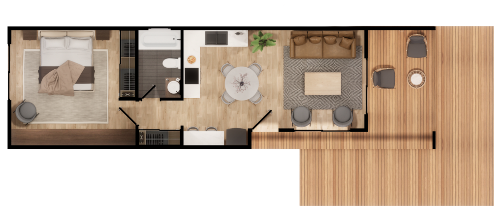 Espacios que se transforman según lo que necesites. En Refugio, un mismo ambiente puede ser comedor al mediodía y sala de estar por la noche, gracias a la distribución integral que aprovecha cada rincón sin saturar. La casa se divide en dos zonas simples: una para compartir y otra para descansar. Perfecta como segunda vivienda o cabaña de fin de semana, donde lo compacto no significa renunciar a la comodidad, sino organizarla mejor.